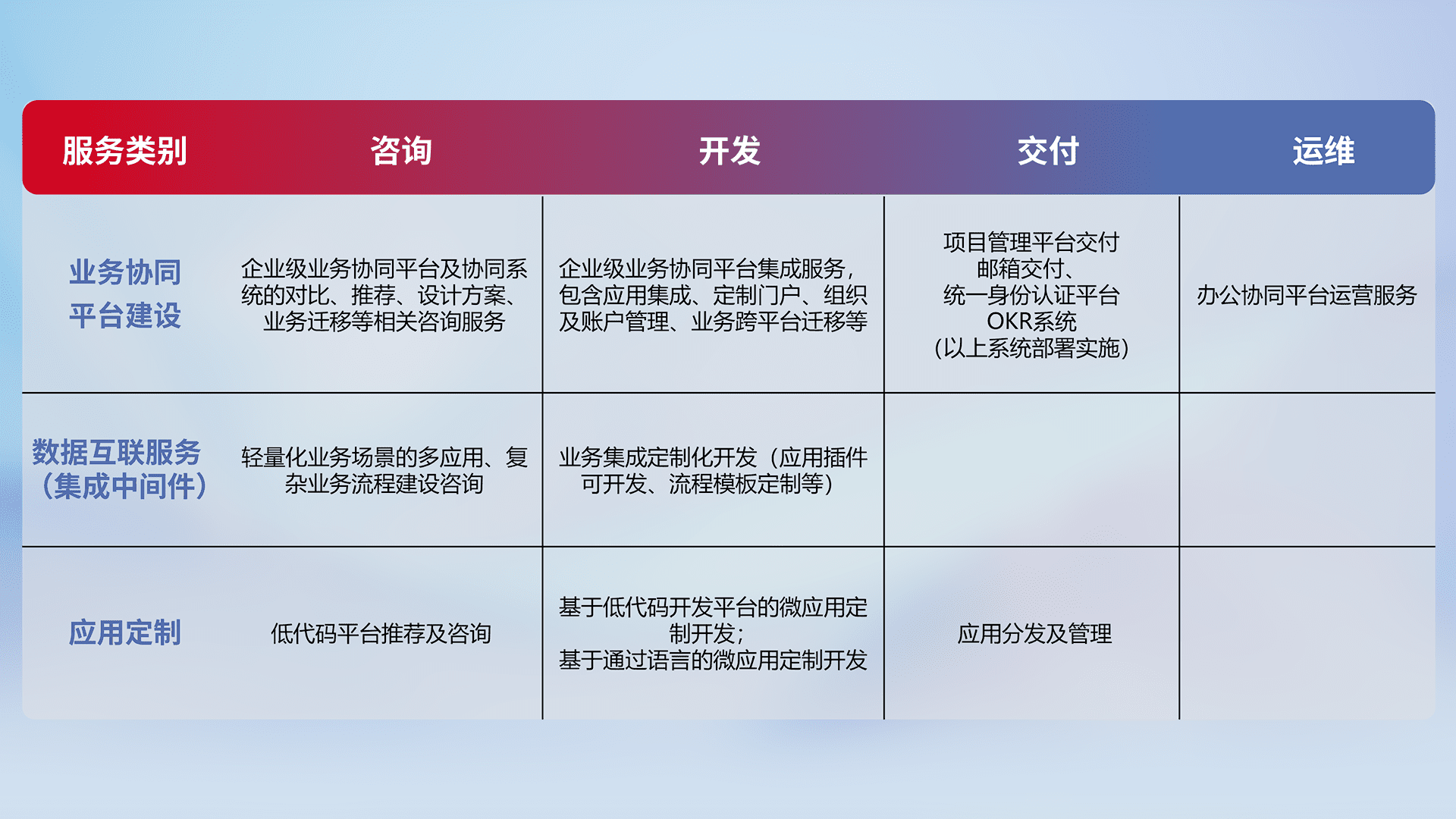 针对钉钉、、、、企微、、IDaas等平台级产品提供产品的规划、、、方案、、、、交付、、、、定制化开发等服务,,,,实现如统一协同办公、、、、智能客户服务、、、混合会议管理、、、、智能数据查询、、等业务场景,,,,实现数字化转型。。